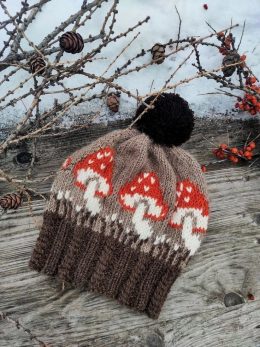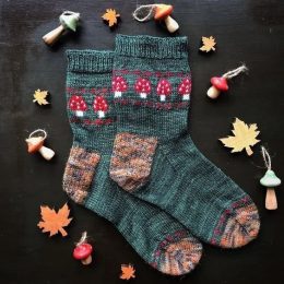 Яркий контраст между серебристо-голубым фоном и красными грибами создаёт ощущение зимней сказки. Узорчатые носки с акцентом на пятках и носках, выполненные в тёплых оттенках, идеально сочетаются с гирляндой в виде грибочков.