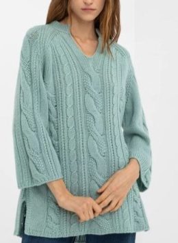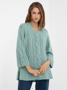 Этот объемный свитер привлекает внимание контрастом между нежным мятным оттенком и сложным узором из кос. Свободный крой позволяет насладиться комфортом, а укороченные рукава и боковые разрезы добавляют современный штрих. Идеальный выбор для холодных дней!