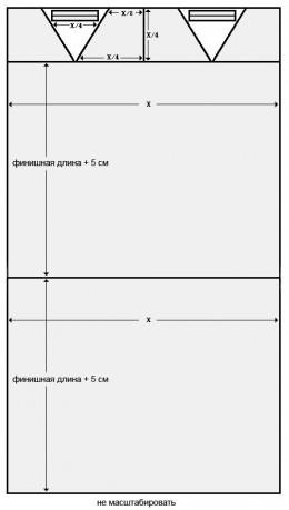 Для пошива этого сарафана вам не понадобится специально подготовленная выкройка. Начертите блоки прямо на ткани относительно ваших размеров (смотрите рисунок). Допуск на шов включен в блоки.