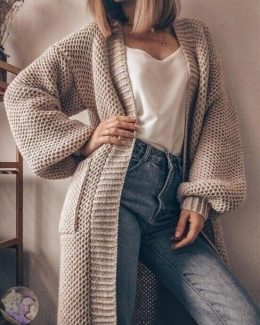 Этот вязаный кардиган словно создан для тех, кто любит окутывать себя теплом и комфортом. Его объемные рукава и мягкая текстура создают ощущение, будто вы носите облако. Идеально подходит для прохладных вечеров и уютных выходных дома.