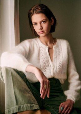 Мягкая текстура и деликатная вязка делают его идеальным выбором для прохладных дней. Уникальные детали, такие как аккуратные пуговицы и нежный кремовый оттенок, подчеркивают утонченность изделия.