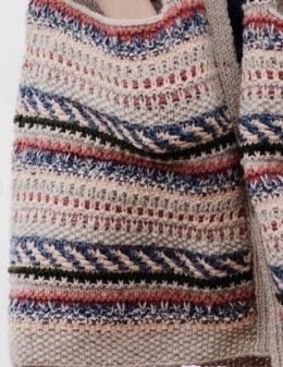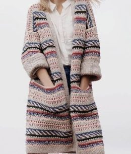 Этот уютный кардиган, связанный спицами, начинается с незаметной детали — изящной белой рубашки под ним, которая подчеркивает его стиль. Яркие полосы и крупные карманы делают его не только теплым, но и невероятно модным.
