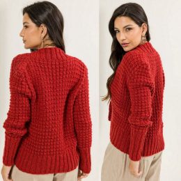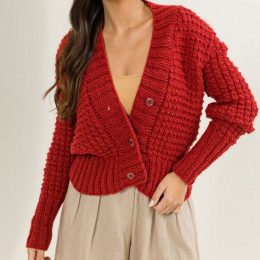 Для вязания нам понадобится 6 мотков красной пряжи: 30% шерсть, 70% акрил; 100 гр — 166 м. Спицы № 4,5. А также 3 пуговицы диаметром 2 см.