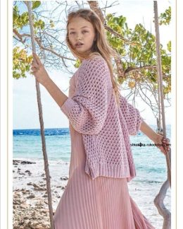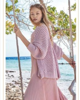 Изделие выполнено из мягкой пряжи нежно-розового цвета с объемным узором, создающим воздушную текстуру и легкость. Рукава слегка присборены, что придает модели романтичный и уютный вид. Особое внимание уделено резинке по низу и манжетам, которая обеспечивает идеальную посадку и комфорт при носке.