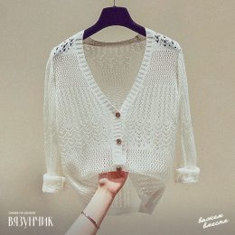Легкий вязаный кардиган из тонкой пряжи с изящным ажурным узором, который создает воздушный и элегантный эффект. Особенностью модели являются декоративные деревянные пуговицы с гравировкой и аккуратные манжеты с подворотом, придающие изделию неповторимый шарм. Идеально подходит для создания легких многослойных образов в прохладное время года.