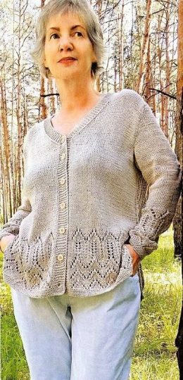 Этот уютный кардиган выполнен из мягкой пряжи и украшен изящными ажурными вставками по краю. Крупные пуговицы добавляют особый шарм, а свободный крой обеспечивает комфорт и стиль. Идеальный выбор для прохладных дней на природе.