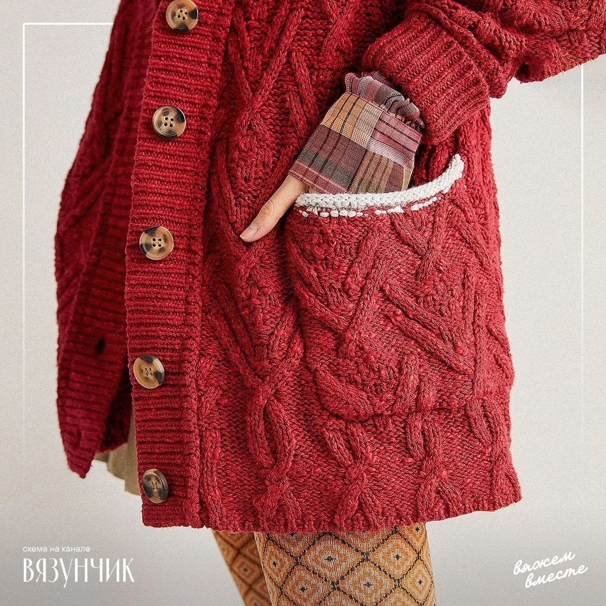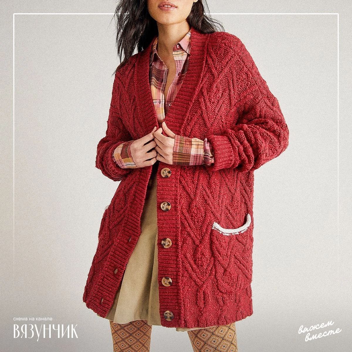 Вязаный кардиган выполнен узором из классических кос, которые использовались в традиционном ирландском вязании с целью символизировать рыбацкие сети и удачу. Особенность модели — контрастные отделочные элементы на карманах и крупные деревянные пуговицы, придающие изделию аутентичный и уютный вид.