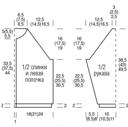 Одновременно для скосов рукава прибавить согласно узору в каждом 6-м р. 5 (7) 9 x 1 п. и в каждом 4-м р. 5 (4) 4 x 1 п. = 55 (59) 65 п.