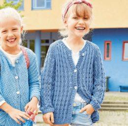 Пряжа (60% хлопка, 40% полиакрила; 90 м/50 г) — 350 (400) 400 г цв. деним; спицы №4 и 5; круговые спицы №4; 5 белых пуговиц в форме сердечек.