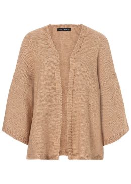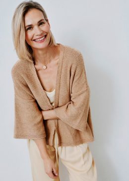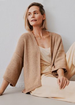 Этот кардиган спицами выполнен из мягкой пряжи приятного бежевого оттенка, что делает его универсальным элементом гардероба. Особое внимание привлекают широкие рукава 3/4 длины и свободный крой, создающие эффект легкости и комфорта. Вязка выполнена простой, но выразительной текстурой, которая подчеркивает натуральность материала и аккуратность исполнения. Такой кардиган отлично сочетается с повседневными и более нарядными образами, добавляя им изящества и уюта.