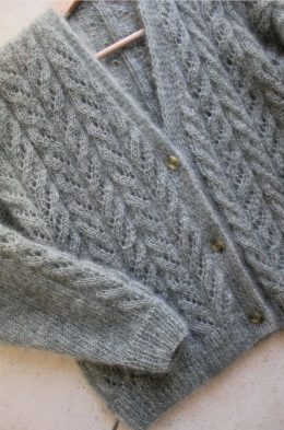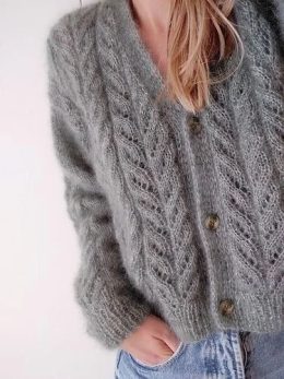 Кардigans, или кардиганы, имеют долгую историю, восходящую к 19 веку, когда они стали популярными среди моряков и солдат. Этот уникальный кардиган выполнен из мягкой мохеровой пряжи, что придаёт ему лёгкость и тепло. Ажурный узор, напоминающий листья, добавляет изысканности и делает изделие универсальным для любого сезона. Застёжка на пуговицы и свободный крой обеспечивают комфорт и стиль в повседневной носке.