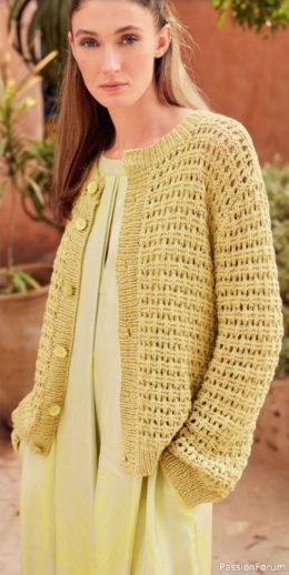 Изящный кардиган, выполненный спицами из легкой пряжи, отличается оригинальным ажурным узором в виде сетки и аккуратной резинкой на манжетах и по краям. Модель с круглым вырезом и застежкой на крупные пуговицы подчеркивает утонченность и воздушность изделия, идеально подходит для весенне-летнего гардероба.