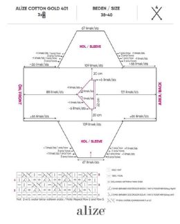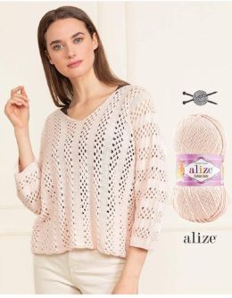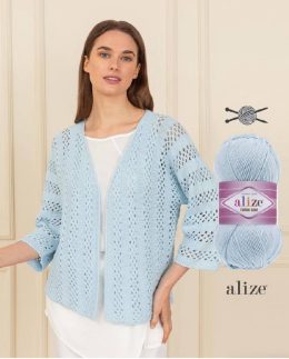 Спицами выполненный кардиган из хлопковой пряжи Alize Cotton Gold отличается легкостью и воздушностью благодаря изящному ажурному узору. Уникальная структура полотна с чередованием полосок и дырочек создает эффект нежной текстуры, идеально подходящей для теплого сезона. Рукава 3/4 и свободный крой обеспечивают комфорт и стильный образ.