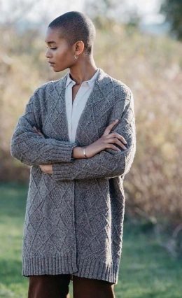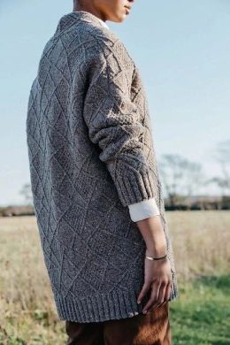 Объемный кардиган с выразительным узором из ромбов и кос, выполненный из мягкой пряжи серого цвета. Удлиненный силуэт с широкими рукавами и рельефной резинкой по краям создает уютный и стильный образ. Идеален для многослойных сочетаний и прохладной погоды, подчеркивает индивидуальность за счет текстурной вязки и лаконичного дизайна.