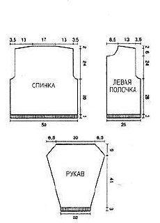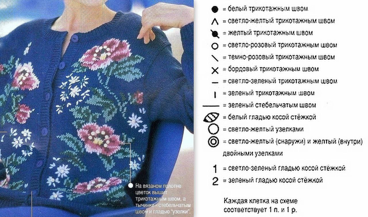 Традиционный кардиган с узкой резинкой на вырезе горловины, бортах и низу украшен крупными цветочными вышивками разными видами стежков. Лепестки маргариток выполнены косой гладью белыми нитками, цветок на вязаном полотне вышит трикотажным швом, а тычинки — стебельчатым швом и гладью «узелки».