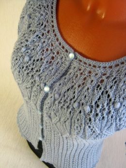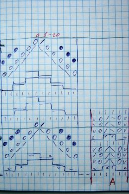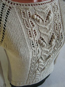 За основу взята: на размер 44-46 (пряжа 400м/100гр, спицы № 3,5) набрать 117пет. + кромочные (и пожеланию, петли для планки), т.е. вначале вяжем узор с шишечками слева (это цифры 4-8) + Раппорт 8пет.*14 раз ==117пет. Кокетка вяжется до 52 ряда, далее желательно связать росток по спинке 4-6 рядов, после этого тело полностью собрать на одну спицу и вязать одним полотном, добрав в районе подмышек по 7петель.