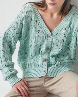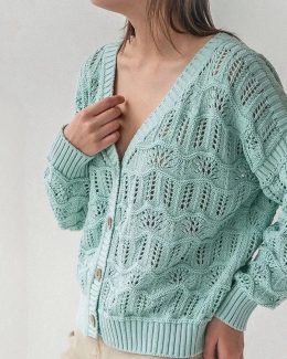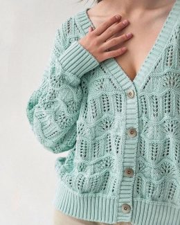 Мудрая мысль: «Совершенство в мелочах, как и в стежках». Эта вязаная спицами кофта привлекает внимание своим нежно-голубым цветом и изящным ажурным узором, добавляя легкости и свежести образу. Деревянные пуговицы служат стильным акцентом, подчеркивая уникальность изделия.