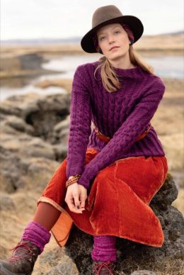 Контраст между насыщенным фиолетовым свитером и яркой оранжевой юбкой привлекает внимание. Свитер с аккуратным узором и шляпа с широкими полями добавляют изюминку.
