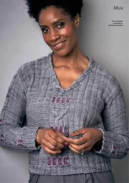 В этом вязании контраст между основным серым цветом и яркими акцентами создаёт стильный образ. Объемные косы придают текстуру, а яркие вкрапления фиолетового цвета добавляют игривости.