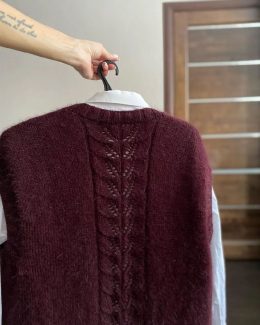 Начнем с аккуратной линии пуговиц, которая скрыта под мягкой вязкой. Этот стильный бордовый жилет из нежной шерсти подчеркивает изысканность каждого образа. Объемный узор на спине добавляет текстуру и уют, делая это изделие идеальным для прохладных дней.