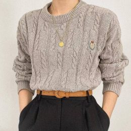 Этот уютный свитер из мягкой пряжи создает контраст с элегантными черными брюками. Плетеный узор придаёт изделию текстурированность, а маленькая вышивка и золотая подвеска добавляют изюминку в образ.