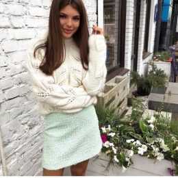 Ах, какой чудесный свитер! Вы только посмотрите на этот восхитительный узор. Такая нежная вязка создаёт ощущение, будто Вы окутаны облаком. И как красиво он сочетается с этой светлой юбкой! Просто загляденье!