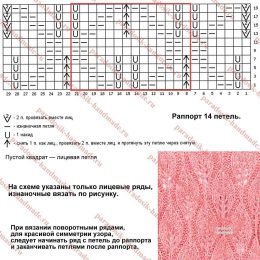 Раппорт узора всего 14 петель и 20 рядов в высоту. На схеме указаны только лицевые ряды, изнаночные вязать по рисунку.