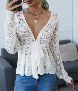 Мудрость заключается в деталях: этот вязаный кардиган с глубоким вырезом и изящным поясом добавит шарма в ваш гардероб. Узорчатая текстура и свободные рукава делают его идеальным выбором для прохладных вечеров.