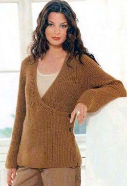 Сборка: выполнить плечевые швы. Вшить рукава, выполнить боковые швы и швы рукавов. Положить правую полочку на левую. Пришить по 2 пуговицы на боковой шов левой и., соответственно, с изнаночной стороны правой полочки.