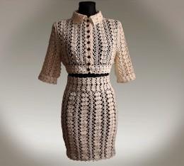 на изящных пуговицах и тонких лентах, создающих эффект драпировки. Крючком выполнены аккуратные декоративные вставки по краям рукавов и пояса, добавляющие текст...