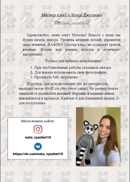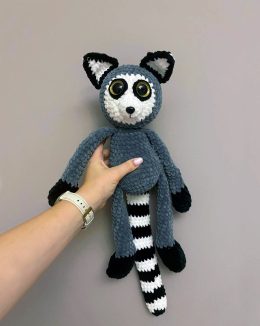 Здравствуйте, как поживаете? Посмотрите на этого очаровательного вязаного лемура! Его большие, выразительные глаза просто не могут оставить равнодушными, а пушистый хвост с черно-белыми полосками добавляет ему особую харизму. Такой друг точно станет центром внимания!