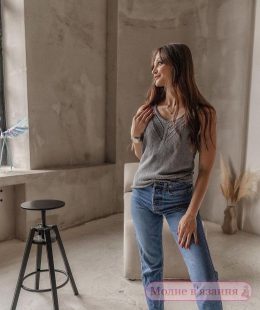 Этот лёгкий топ спицами сочетает в себе простоту и изящество благодаря уникальному ажурному узору на лифе и аккуратной отделке по краям. Модель выполнена из тонкой, дышащей пряжи, идеально подходящей для тёплой погоды. Особое внимание уделено V-образному вырезу и плавным линиям, которые подчеркивают женственную фигуру. Такой топ станет универсальным элементом летнего гардероба, легко комбинируется с джинсами и юбками.