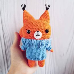 Черные усики этой игрушки сразу привлекают внимание. Вязаная лисичка выполнена в ярко-оранжевом цвете и одета в милый голубой свитер с высоким воротником. Ее большие глаза и аккуратные ушки делают ее особенно очаровательной.