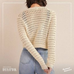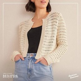 Этот изящный кардиган связан крючком с уникальным ажурным узором, создающим легкость и воздушность. Особое внимание привлекают аккуратные края и оригинальная текстура, которые делают его идеальным для повседневного образа.