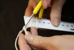 11. Снимите петли с линейки и повторите пункты 4 и 5, только в этот раз начните с трех петель. Закрепите столбик. Далее сделайте 5 столбиков по 6 петель и еще один последний столбик – 3 петли.