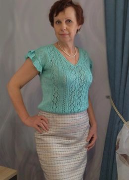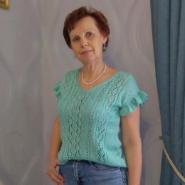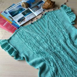 Интересный факт: этот изящный топ связан вручную с использованием ажурного узора, придающего ему особую легкость. Нежные воланы на рукавах и изумительный бирюзовый цвет делают его идеальным выбором для теплых дней.
