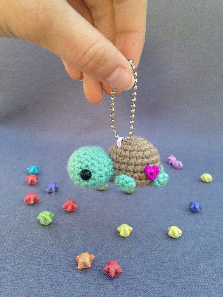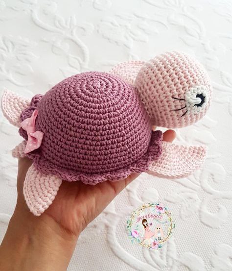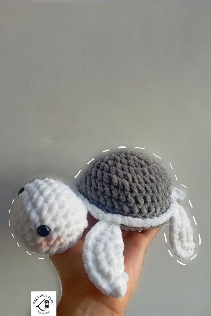 Мягкая игрушка черепашка с объемной текстурой и выразительными глазами, выполненная из плюшевой пряжи с коричневыми пятнами и светло-голубым телом.
