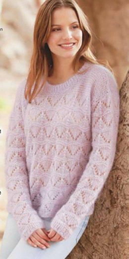 Этот свитер, словно облако, обнимает нежностью и уютом. Лавандовый цвет и ажурный узор придают ему воздушность, а мягкая текстура делает его идеальным для прохладных дней.