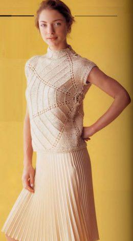 Очень красивый, необычный, вязанный спицами летный топ. Необычный за счет асимметричности узора. Вяжется такой топ от цветка на боку. Юбка плиссе или солнце из натуральных летних тканей дополнит комплект. На картинке цвета, так сказать съедобные, кремовые. Но можно использовать и более яркие оттенки, например бирюзовый или желтый. Получится очень яркий, летний топ.