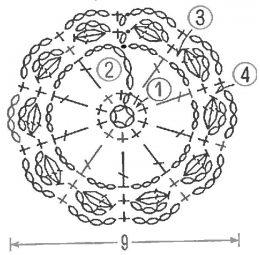 Вяжется он крючком по схеме, всего 4 ряда, около 9 см. в диаметре.