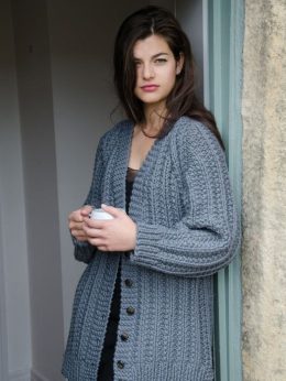 Очаровательное серое вязаное кардиган с объемными рукавами и выразительной текстурой.