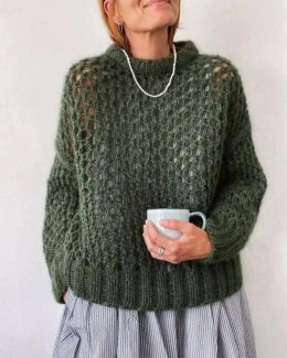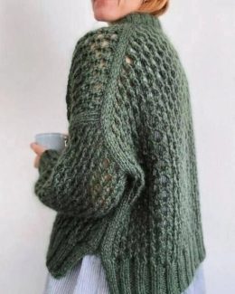 Глубокий зеленый цвет и крупная вязка придают изделию неповторимый шарм. Свитер украшен ажурными вставками, которые добавляют легкости и изысканности.