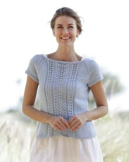 Очаровательный образ представлен в виде лёгкого вязаного топа с короткими рукавами.