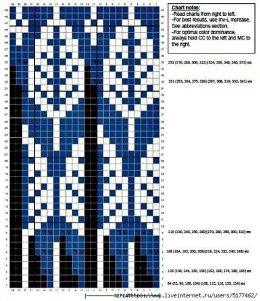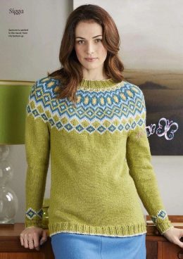 Свободный свитер с короткими рукавами украшен красно-синим орнаментом в стиле фольклорных мотивов на светлом фоне. Особенность модели — контрастные полосатые ма...