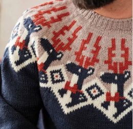 Этот свитер ручной работы удивляет сочетанием традиционного и современного дизайна. Потрясающие графические узоры с изображением самолетов и молний, выполненные в красно-бело-синей гамме, создают уникальный и стильный образ. Идеально подходит для любителей оригинальной одежды и теплых зимних вечеров.