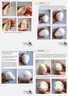 Деталь: мягкое белое тело зайки с выразительными черными глазками и длинными ушами, выполненными из нежной пряжи с розовым внутренним окрасом, создающими реалис...