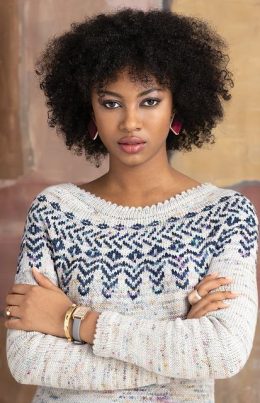 Контраст между темными и светлыми нитями создает эффектный узор на свитере. Внимание привлекают яркие геометрические мотивы и аккуратная вязка, подчеркивающие с...
