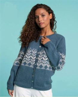 Этот кардиган связан спицами, и с каждой петлей в него вложена душа мастера. Легкий голубой оттенок гармонично сочетается с белым узором, который напоминает зас...