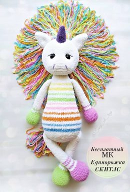 Познакомьтесь с этим милым вязаными единорогом! Его разноцветная грива из ниток привлекает внимание, а разноцветные полоски на теле добавляют ещё больше очарова...