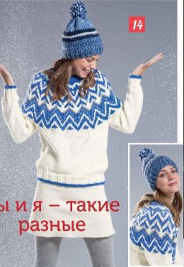 Ты только посмотри на этот свитер с шапкой! Яркие синие узоры в стиле зигзаг добавляют динамики и веселья. А помпон на шапке — это просто находка для создания и...